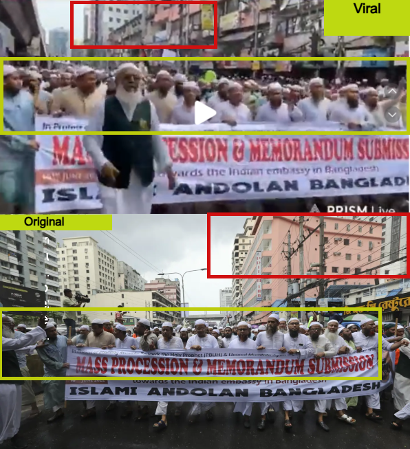 ভাইরাল ভিডিয়োর শুরুতেই মিছিলের যে ফ্রেমটি দেখতে পাওয়া যায়, সেটার রিভার্স ইমেজ সার্চ করলে দেখা যায় যে, suel1002 নামের একটি টিকটক অ্যাকাউন্টে একই দাবি-সহ ভিডিয়োটি পোস্ট করা হয়েছিল। তবে, সেই ভিডিয়োতে প্রতিবাদীদের হাতে যে বড় ফ্লেক্সটি দেখতে পাওয়া যায়, সেটার নীচের দিকে ইংরেজিতে লেখা ছিল ‘June’ এবং ‘Islami Andolon Bangladesh’।
