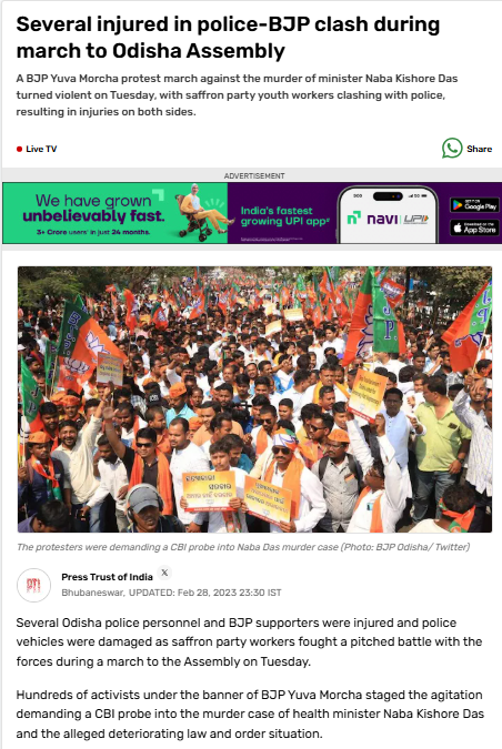 ২০২৩ সালের ২৮ ফেব্রুয়ারি, India Today ওয়েবসাইটে প্রকাশিত একটি প্রতিবেদ থেকে জানা যায় যে, রাজ্যের আইন-শৃঙ্খলা পরিস্থিতির অভিয়োগ তুলে, সেই সময় বিধানসভা অভিযান করেছিল, ওড়িশা বিজেপি যুব মোর্চার কর্মীরা। পুলিশ সেই অভিযান আটকালে, বিজেপি কর্মী-সমর্থকদের সঙ্গে পুলিশের দ্বন্দ্ব বেধে গিয়েছিল। বিজেপি কর্মীদের বিরুদ্ধে কর্তব্যরত পুলিশকে পেটানোর অভিযোগ উঠেছিল। পাল্টা মারধরের অভিযোগ করেছিল বিজেপিও। জানা গিয়েছে, ওই ঘটনায় ভুবনেশ্বর পুলিশের ডিসিপি প্রতীক সিং-সহ ১০ জন পুলিশ কর্মী জখম হয়েছিলেন। শতাধিক বিজেপি কর্মীকে আটক করা হয়েছিল।
