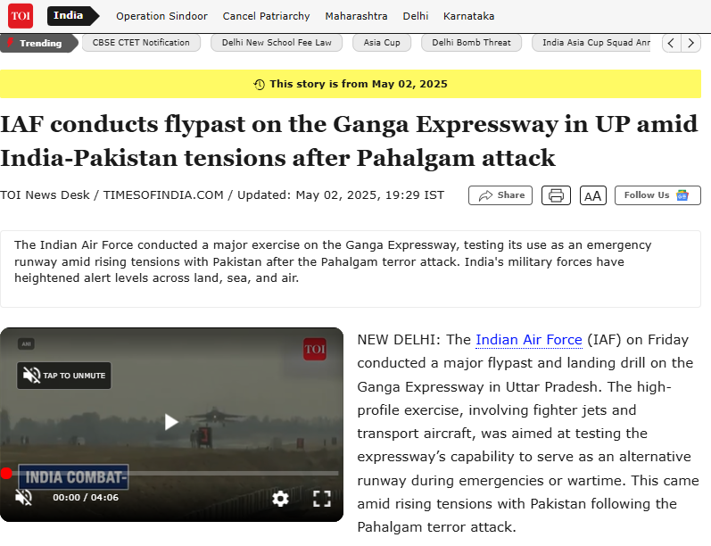 ভাইরাল ভিডিয়োর কি-ফ্রেমের রিভার্স ইমেজ সার্চ করলে দেখা যায় যে, ২ মে ২০২৫ তারিখ, Times of India-র অফিসিয়াল ওয়েবসাইটে একই ভিডিয়ো-সহ একটি প্রতিবেদন প্রকাশিত হয়েছিল। সেই প্রতিবেদন থেকে জানা যায় যে, উত্তরপ্রদেশের গঙ্গা এক্সপ্রেসওয়েতে, যুদ্ধবিমান ও পণ্যবাহী বিমান-সহ একটি মহড়া চালিয়েছিল ভারতীয় বায়ু সেনা। বিশেষ পরিস্থিতিতে যাতে ওই এক্সপ্রেসওয়েকে রানওয়ে হিসেবে ব্যবহার করা যায়, সেজন্য বায়ু সেনার ওই মহড়া হয়েছিল বলে জানা গিয়েছিল।