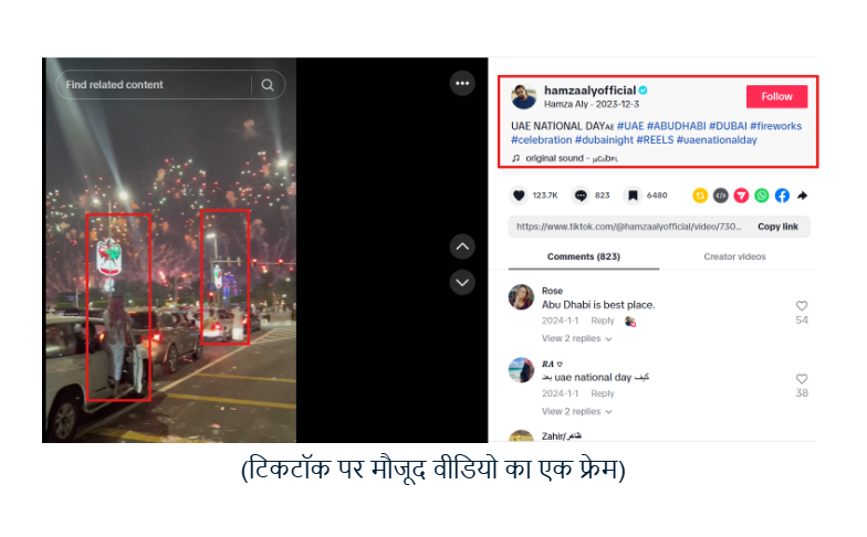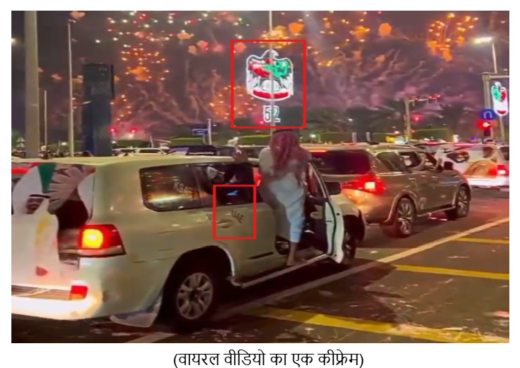ভাইরাল ভিডিয়োটি ভালোভাবে পর্যবেক্ষণ করলে দেখা যায় যে, একটি খুঁটিতে একটি পাখির প্রতীক এবং ‘৫২’ সংখ্যাটি রয়েছে। কাছাকাছি পার্ক করা একটি গাড়িতে UAE শব্দটি লেখা ছিল। যা স্পষ্টভাবে ইঙ্গিত দেয় যে ভিডিয়োটি সংযুক্ত আরব আমিরাশাহির ৫২তম জাতীয় দিবস উদযাপনের।