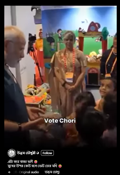 সোশ্যাল মিডিয়ায় একটি ছোট ভিডিয়ো ছড়িয়েছে, যেখানে দেখা যাচ্ছে যে, প্রধানমন্ত্রী নরেন্দ্র মোদীর সামনে দাঁড়িয়ে, তাঁর বিরুদ্ধে ভোট চুরির অভিযোগ করছে ছোট ছোট শিশুরা। ভিডিয়োটে দেখা যাচ্ছে, শিশুদের সঙ্গে কথা বলার সময়, প্রধানমন্ত্রী তাদের প্রশ্ন করছিলেন, “তোমরা জানো আমি কী করি?” উত্তরে শিশুরা বলছে, “ভোট চুরি”।
