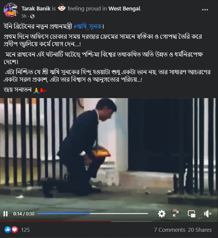 ভাইরাল ভিডিওতে দেখা যাচ্ছে ঋষি সুনাক একটি বাড়ির দরজার সামনে প্রদীপ জ্বালাচ্ছেন। ভিডিওটির সাথে আরো বলা হয়েছে – যে পশ্চিমের দেশে এক সময় হিন্দুধর্মকে ও হিন্দুদের নিচু চোখে দেখা হতো সেই দেশের মাটিতে আজ হিন্দু ধর্মের রীতি পালন করা হচ্ছে। শুধু মাত্র ভোট পাওয়ার জন্য নয়, ঋষিকে দেখেই বোঝা যাচ্ছে তিনি মনপ্রাণ থেকে সত্যিই নিজের ধর্মকে শ্রদ্ধা করেন।