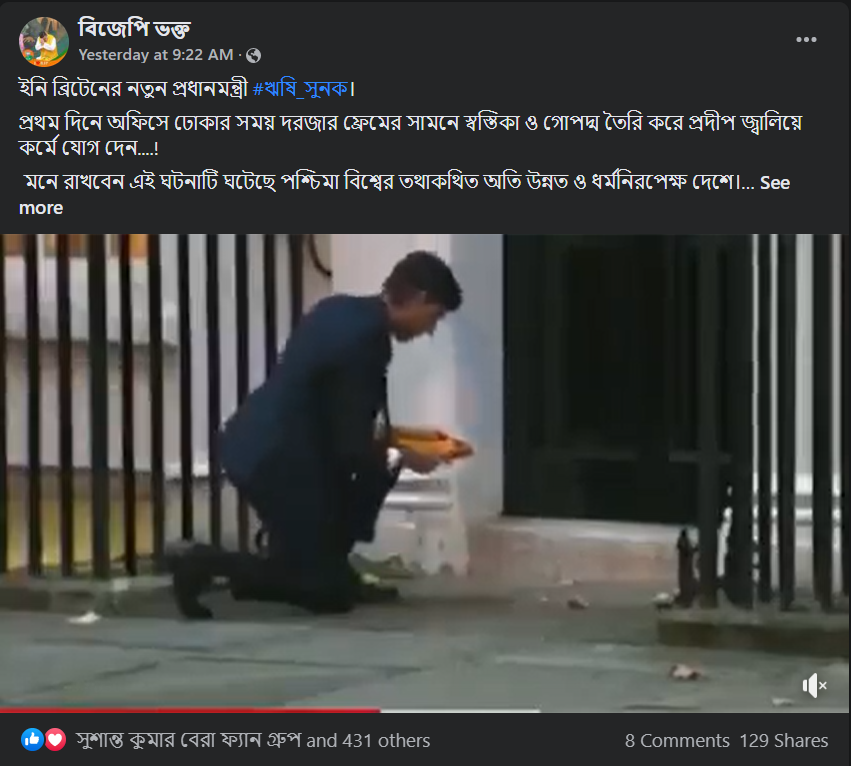 ব্রিটেনের রাজপাটে পরিবর্তনে আবহে ফেসবুকে ভাইরাল দাবি নব নির্বাচিত প্রধানমন্ত্রী ঋষি সুনাক প্রথম দিন নিজের কার্যালয়ে প্রবেশের আগে দরজায় প্রদীপ জ্বালিয়েছেন।