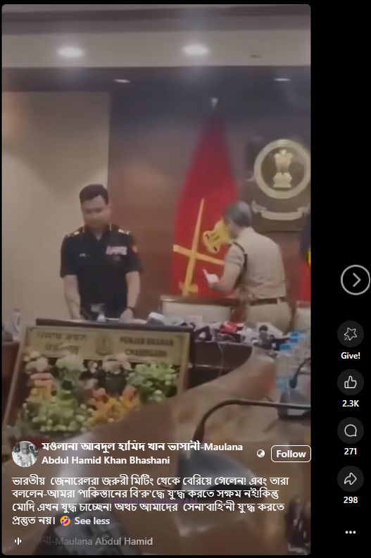 এই পরিস্থিতিতে সোশ্যাল মিডিয়ায় ছড়িয়েছে একটি ভিডিয়ো। যা পোস্ট করে দাবি করা হচ্ছে যে, পাকিস্তানের সঙ্গে যুদ্ধ করতে সক্ষম নয় ভারতীয় সেনা-এই বক্তব্য জানিয়েছেন ভারতীয় আর্মি জেনারেলরা এবং তারা মিটিং ছেড়ে চলে গিয়েছেন। তাঁরা আরও অভিযোগ করেছেন যে, ভারতের প্রধানমন্ত্রী নরেন্দ্র মোদী, যুদ্ধের জন্য সেনার উপর চাপ সৃষ্টি করছেন।