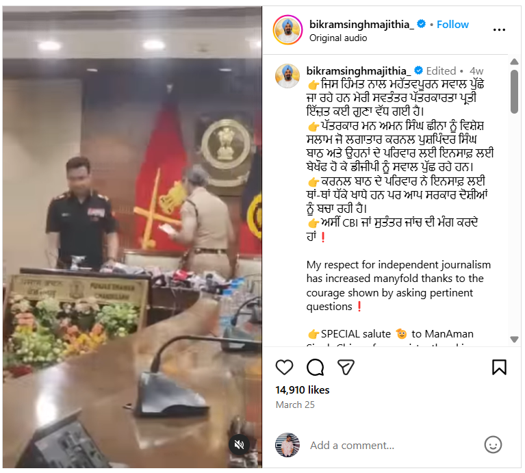 ভাইরাল ভিডিয়োর কিফ্রেমের রিভার্স ইমেজ সার্চ করলে দেখা যায় যে, গত ২৫ এপ্রিল, একই ভিডিয়ো পোস্ট করেছিলেন পঞ্জাবের অকালি দলের নেতা Bikram Singh Majithia। ওই পোস্টে সাংবাদিক মান অমন সিং ছিনাকে তিনি ধন্যবাদ জানিয়েছিলেন এবং দাবি করেছিলেন যে, কর্নেল পুষ্পিন্দর সিং ভাট ও তাঁর পরিবার সম্পর্কে প্রশ্ন করার সাহস দেখিয়েছিলেন ওই সাংবাদিক।