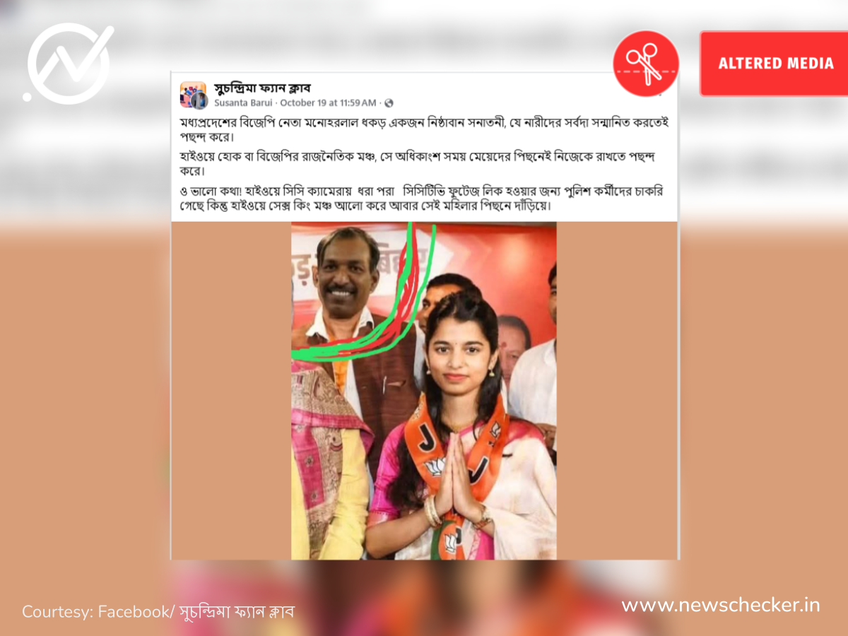 ভাইরাল ছবিটি সম্পাদিত। বিহারের বিজেপি প্রার্থী তথা লোকসংগীত শিল্পী মৈথিলী ঠাকুরের পিছনে যাকে দাঁড়িয়ে থাকতে দেখা যাচ্ছে, সে যৌন কেলেঙ্কারিতে অভিযুক্ত মধ্যপ্রদেশের বিজেপি নেতা মনোহরলাল ধাকড় নয়।