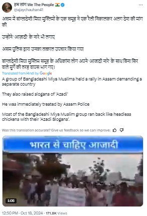 Several social media users are circulating a 1-minute 24-second video, claiming it shows a group of illegal Bangladeshi Muslim migrants holding a rally in Assam, demanding a separate country, before getting thrashed by the police. “…They also raised slogans of ‘Azadi’. They were immediately treated by the Assam Police,” read one X post, translated from Hindi, which has clocked 171.8K views.