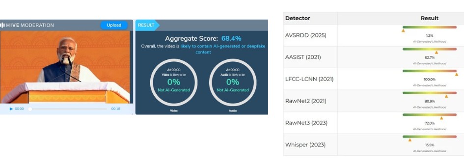 The video was analysed using Hive Moderation, which indicated a 68.4% probability that the media contains AI-generated or deepfake content. Additionally, four out of six detectors of Deepfake-o-meter flagged the audio as highly likely to be AI-generated, including one model showing a 100% probability.
