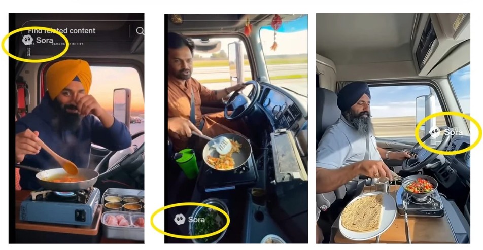 Although AI detection tools did not conclusively flag the clip as synthetic, similar videos (seen here, here and here) with the watermark of Sora (OpenAI’s AI video-generating model), featuring “truck drivers cooking curry”, have been widely circulated online.