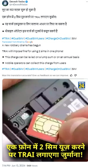 Newschecker first ran a keyword search for “TRAI rules dual sim”, which led us to this Times of India report, dated June 13, 2024, headlined, “Your Phone No. May Come At A Cost As TRAI Mulls Fee”.