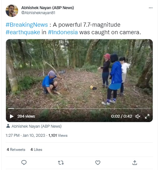 After a deep-sea-earthquake hit Indonesia on Tuesday, several social media users shared visuals purportedly showing the effects of tremblor in the archipelago. Among the many videos being shared online, one set of visuals, purportedly from a forest where a group of people are seen crouching and falling over due to the tremors, has gone viral. Those who shared the video claimed that it showed the recent Indonesian earthquake whose tremors were felt all the way till Northern Australia. Newschecker found the claim to be untrue.