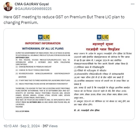 We then looked up the official X account of LIC, which reposted a tweet by PIB Fact Check, dated September 2, 2024, dismissing the viral letter as fake. “A notice allegedly issued by LIC is doing the rounds on social media & claims that it is going to withdraw all insurance products/plans for revision on 30 September 2024. No such notice has been issued by @LICIndiaForever,” read the post.