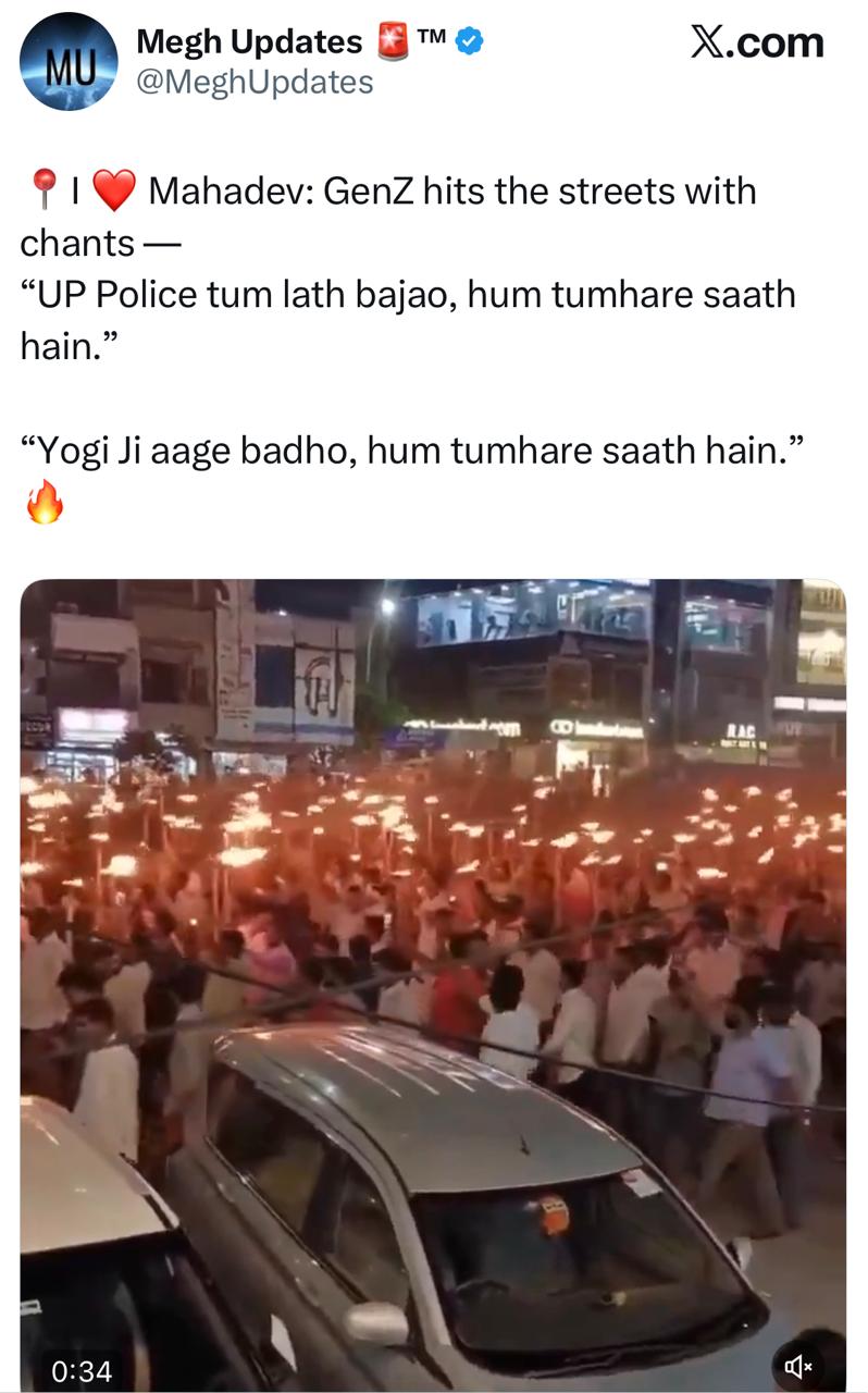 A video claims to show Gen-Z youth in Uttar Pradesh leading a torchlight rally in support of the “I Love Mahadev” campaign and the Yogi Adityanath-led government. The crowd can be heard chanting: “UP Police tum lath bajao, hum tumhare saath hain” (UP Police, use force, we are with you).