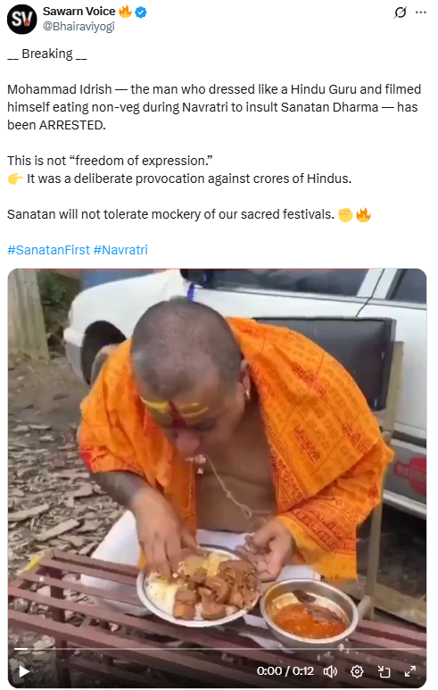Sharing that clip on X handle, a user wrote, “Breaking __ Mohammad Idrish — the man who dressed like a Hindu Guru and filmed himself eating non-veg during Navratri to insult Sanatan Dharma — has been ARRESTED. This is not “freedom of expression.” It was a deliberate provocation against crores of Hindus. Sanatan will not tolerate mockery of our sacred festivals.” (The archived link of the post can be seen here.)