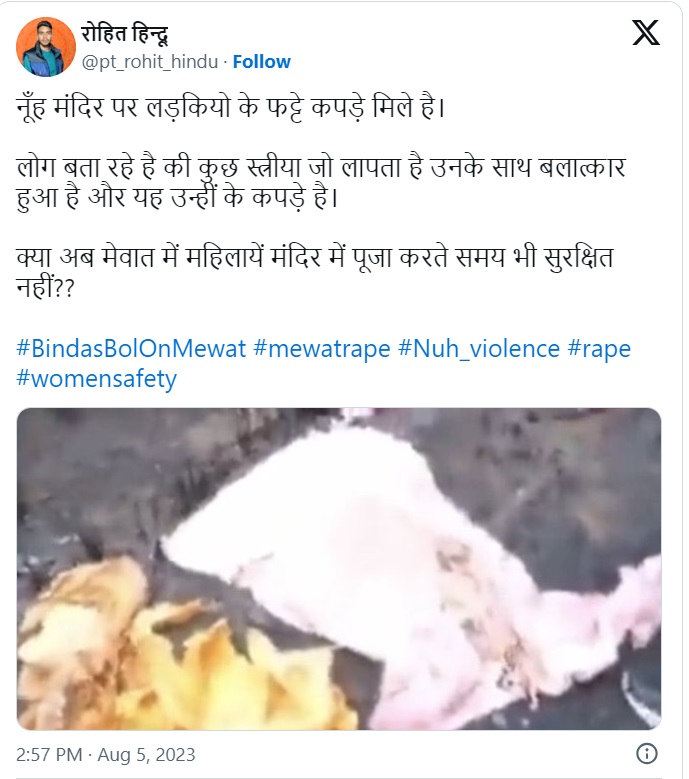 The “report” published by social media based news channel Leading Bharat TV (which has since been deleted), features a ground report on the Nuh violence, where the reporter is seen interviewing a few people, allegedly locals, who claim on record that women participants of the Jal Abhishek Yatra who took refuge in the Nalhar Shiv Temple were dragged away to the fields and raped. The camera also pans to show women’s attire strewn around.
