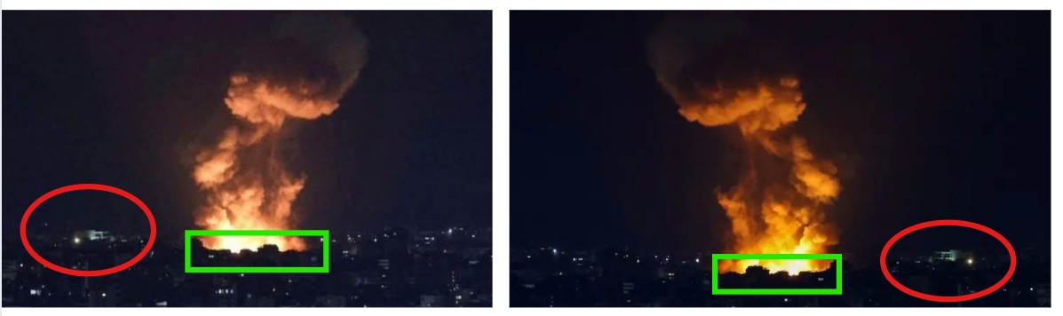 The same photo appeared in The Wall Street Journal, captioned, “Flames rise from burning cars at the site of a car bombing that hit Beirut’s southern suburb of Haret Hreik, a Hezbollah stronghold.”