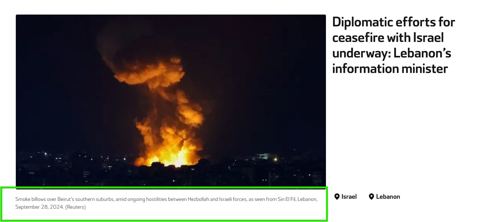The caption read, “Smoke billows over Beirut’s southern suburbs, amid ongoing hostilities between Hezbollah and Israeli forces.”