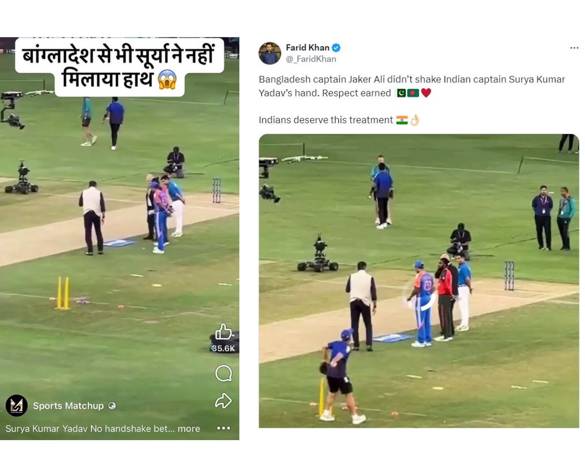A video circulating on social media claims that during the Asia Cup Super Four match between India and Bangladesh on September 24, Indian skipper Suryakumar Yadav did not shake hands with the Bangladesh captain, Jaker Ali, during the toss. Some posts also suggest that the Bangladesh captain refused to shake hands with Yadav.