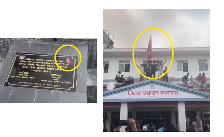 It shows Gen-Z protesters storming the district administration office in Chitwan, Nepal, in September 2025.