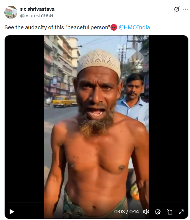 A 14-second video has gone viral on social media. In it, a Muslim man is purportedly saying, “I’m from superpower Bangladesh. I am living in Kolkata, and I fully support Mamata Banerjee. We Bangladeshis will soon rule West Bengal. Remember my words, brother.” Users are sharing the video, claiming it to be a real incident. They are also targeting the West Bengal government and the Muslim community, writing, “See the audacity of this “peaceful person”” (Archive Link)
