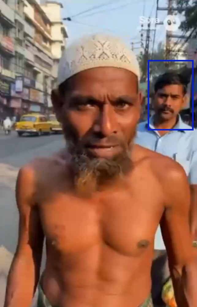 A close look reveals an expressionless, frozen-faced man in the background, an anomaly common in AI-generated scenes where secondary characters lack realistic motion or emotion.