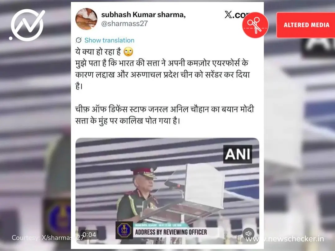 A viral video alleged that Chief of Defence Staff (CDS) General Anil Chauhan said the Indian government “surrendered” Arunachal Pradesh and Ladakh to China due to a weak Air Force. Newschecker found the audio was doctored using an AI-generated voiceover, and that General Chauhan made no such statement.