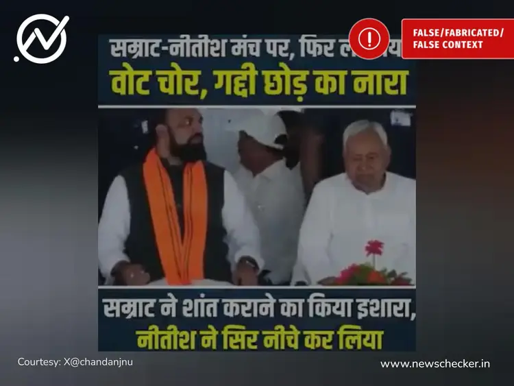 Ahead of the Bihar state assembly elections, a video allegedly showing chief minister Nitish Kumar and deputy chief minister Samrat Choudhary being heckled with slogans of “vote chor, gaddi chhod” (“vote thief, leave the throne”) during a public event has gone viral online. Newschecker’s investigation however found the claim to be untrue. Read more here.