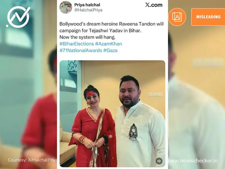 A video is circulating on social media showing RJD leader Tejashwi Yadav meeting and posing with Raveena Tandon. The post claims this is a recent meeting and suggests that the actor will campaign for Yadav in the upcoming Bihar Assembly elections. Newschecker, however, found the video to be old. Read more here.