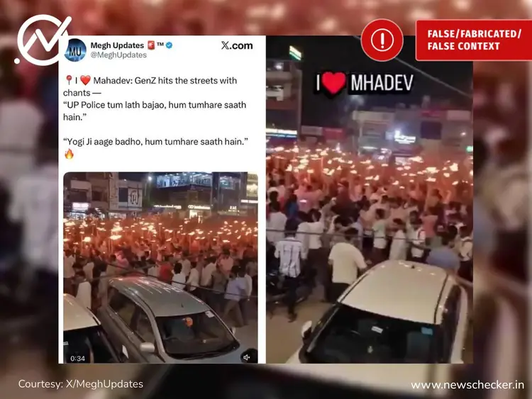 A video claims to show Gen-Z youth in Uttar Pradesh leading a torchlight rally in support of the “I Love Mahadev” campaign and the Yogi Adityanath-led government. The crowd can be heard chanting: “UP Police tum lath bajao, hum tumhare saath hain.” Newschecker’s investigation, however, found the claim to be false. Read more here.