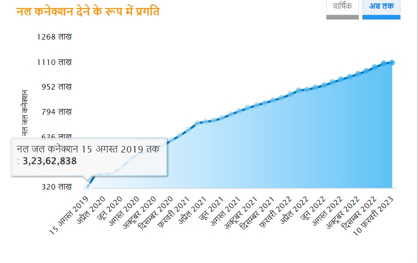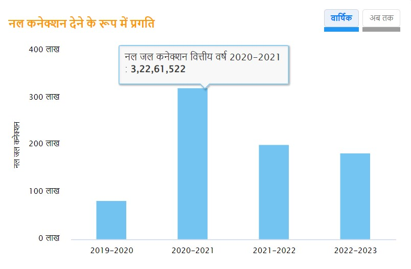યોજનાના વાસ્તવિક સમયના ડેટા અનુસાર, વર્ષ 2020-21માં સૌથી વધુ પાણીના જોડાણો આપવામાં આવ્યા હતા, ત્યારબાદ વર્ષ 2021-22માં 2 કરોડ અને ગયા વર્ષે 1 કરોડ 83 લાખ ઘરોમાં નાદ કનેક્શન આપવામાં આવ્યા હતા.