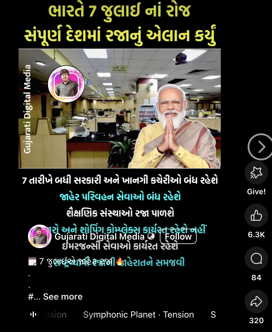 તદુપરાંત, અમે કેન્દ્ર સરકારના વિવિધ વિભાગોની વેબસાઇટ અને રાજ્ય સરકારના વિભાગોની વેબસાઇટ પણ તપાસી. ત્યાં પણ સાતમી જુલાઈ મામલે કોઈ સત્તાવાર જાહેર રજાનો હુકમ ઉપલબ્ધ નથી. સાથે સાથે અમે કેન્દ્ર સરકારના પ્રેસ ઇન્ફર્મેશન બ્યૂરો અને ગુજરાત સરકારના માહિતી વિભાગના સોશિયલ મીડિયા હેન્ડલ પણ ચકાસ્યા. અહીં પણ સાતમી જુલાઈ મામલે કોઈ જાહેરાત કરાયેલ નથી.