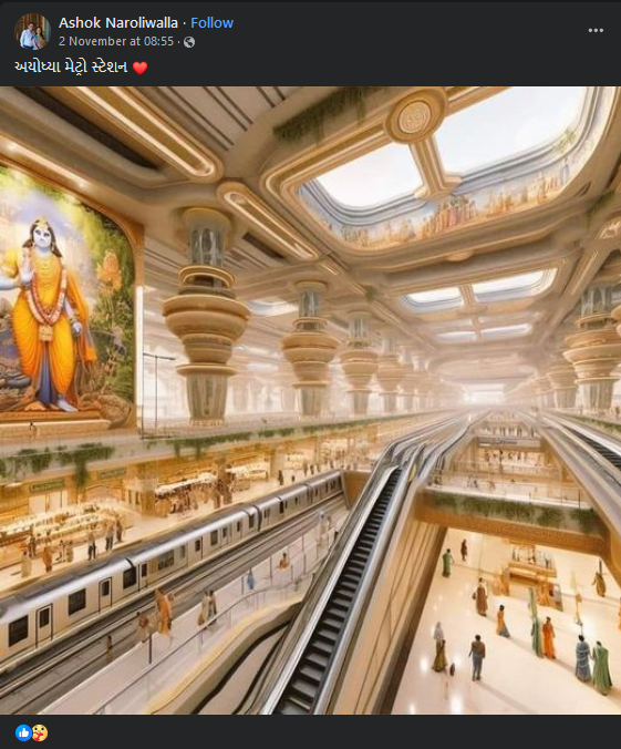અયોધ્યામાં નવું તૈયાર થઈ રહેલ મેટ્રો સ્ટેશનના નામે AI દ્વારા બનાવવામાં આવેલ તસ્વીર શેર કરવામાં આવેલ છે. અયોધ્યા સ્ટેશનના નામે ભ્રામક દાવા સાથે તસ્વીર શેર કરવામાં આવેલ છે.