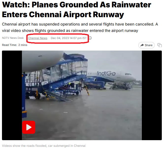 તપાસ દરમિયાન, અમને 4 ડિસેમ્બર 2023 ના રોજ NDTV દ્વારા પ્રકાશિત એક અહેવાલ મળ્યો, જેમાં વાયરલ વિડિઓ હાજર છે. આ અહેવાલમાં, વિડિઓ ચેન્નાઈ એરપોર્ટનો હોવાનું કહેવાય છે. તે સમયે, મિચોંગ ચક્રવાતને કારણે, એરપોર્ટ રનવે પર ભારે પાણી ભરાઈ ગયું હતું. પૂર જેવી પરિસ્થિતિને કારણે, 12 સ્થાનિક અને 4 આંતરરાષ્ટ્રીય ફ્લાઇટ્સ રદ કરવી પડી હતી.