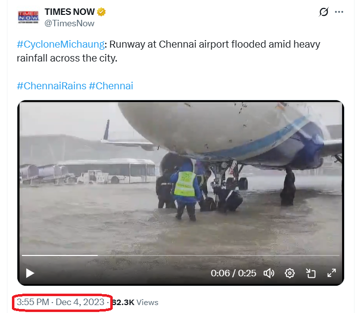પૂરગ્રસ્ત મુંબઈ એરપોર્ટનો હોવાનો દાવો કરતા વાયરલ વીડિયોની તપાસ કરવા માટે, અમે ગૂગલ લેન્સ પર તેના મુખ્ય ફ્રેમ્સ શોધ્યા. આ દરમિયાન, અમને 4 ડિસેમ્બર 2023ના રોજ ટાઇમ્સ નાઉના X હેન્ડલ પરથી પોસ્ટ કરાયેલ આ વીડિયો મળ્યો. પોસ્ટના કેપ્શનમાં જણાવાયું છે કે આ વીડિયો ચેન્નાઈ એરપોર્ટનો છે, જ્યાં મિચોંગ ચક્રવાતને કારણે એરપોર્ટ રનવે પર પાણી ભરાઈ ગયું હતું.
