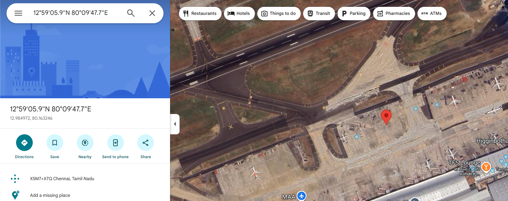 વાયરલ વીડિયોની શરૂઆતમાં, આપણે એક પીળો બોર્ડ જોઈએ છીએ જેના પર 12° 59 ‘5.9” N 80° 9’ 47.686” E લખેલું છે. આ (DMS) કોડ ડિગ્રી છે. વાસ્તવમાં આ કોડ અક્ષાંશ અને રેખાંશ ભૌગોલિક કોઓર્ડિનેટ્સ છે, જે વિમાનની વર્તમાન સ્થિતિ અને નેવિગેશનમાં મદદ કરે છે. જ્યારે અમે આ કોડ ગૂગલ મેપ્સ પર શોધ્યો, ત્યારે અમને જાણવા મળ્યું કે આ સ્થળ ચેન્નાઈ એરપોર્ટનું છે.