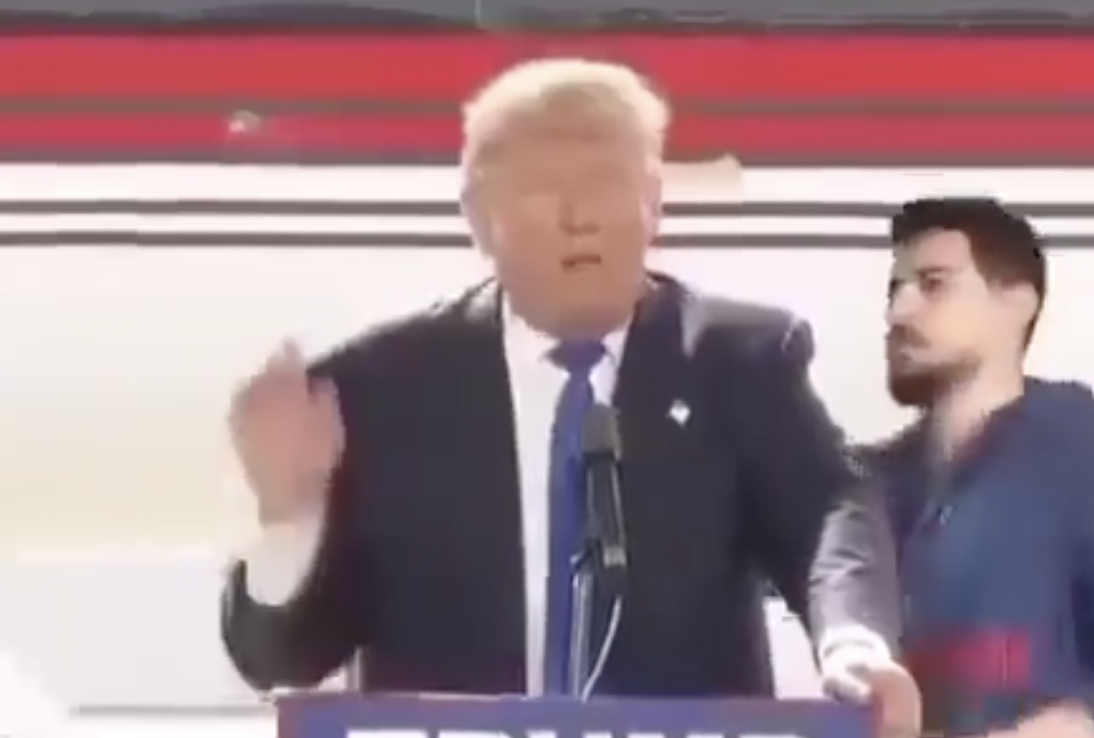 સોશિયલ મીડિયામાં વાઇરલ વીડિયોમાં ટ્રમ્પ એક સભા સંબોધી રહ્યા છે અને તેમાં એક યુવક ઉઠીને ટ્રમ્પને પાછળથી લાફો ઝીંકી રહ્યો છે અને પછી તરત તે ભાગી રહ્યો તે દર્શાવાયું છે.