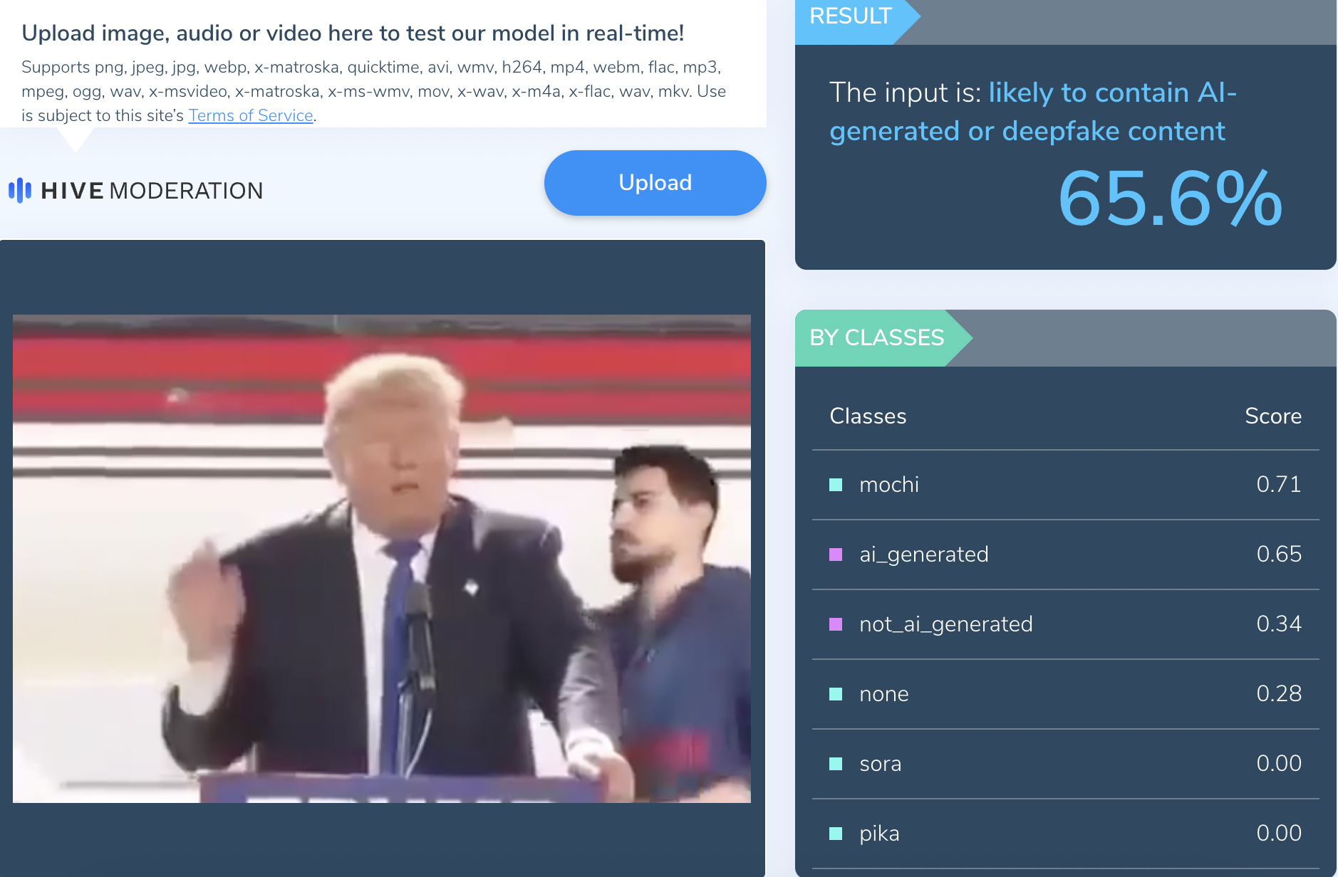 AI ડિટેક્શન ટૂલ ઑથેન્ટા (Authenta)માં અમને પરિણામ મળ્યું કે, વાઇરલ વીડિયો 100 ટકા એઆઈ જનરેટેડ છે. વળી AI ડિટેક્શન ટૂલ Hive Moderation (હાઇવ મૉડરેશન)માં પરિણામ મળ્યું કે, વીડિયો ખરેખર 65 ટકા એઆઈ જનરેટેડ છે.