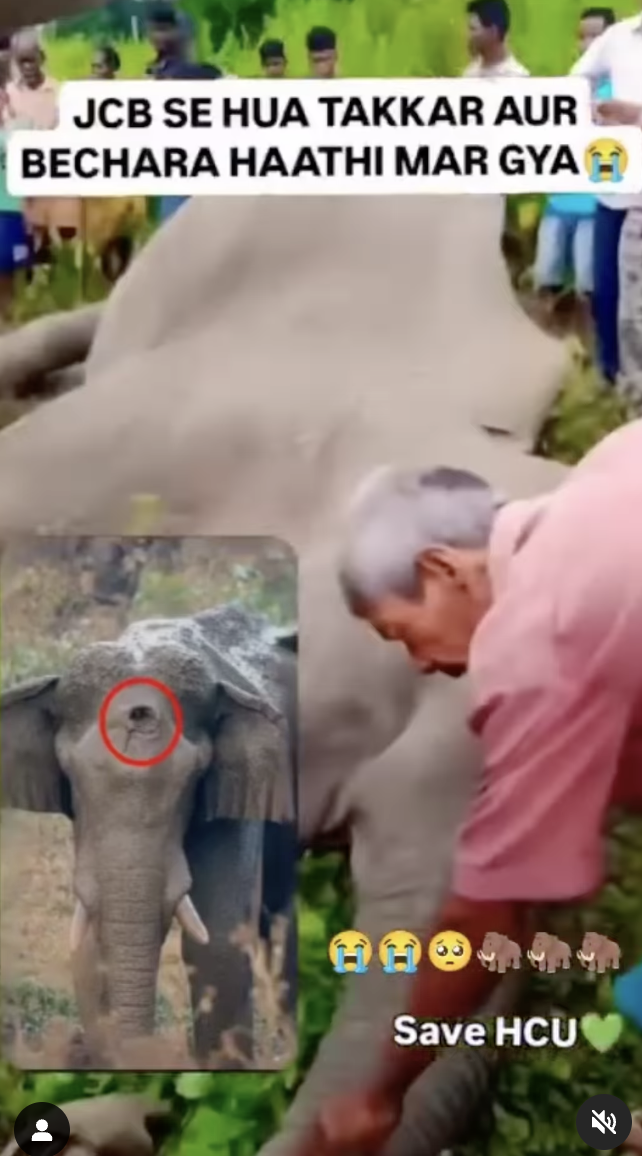 જેમાં સોશિયલ મીડિયામાં હૈદરાબાદના જંગલોમાં બુલડોઝર દ્વારા હાથી પર હુમલો કરવામાં આવ્યો હોવાના દાવા સાથે એક વીડિયો વાયરલ થઈ રહ્યો છે. વાઇરલ વીડિયોમાં સૂંઢમાં કાણું પડી ગયેલો હાથી દર્શાવાયો છે અને બાદમાં તે મૃત્યુ થતા જમીન પર પડેલો દર્શાવાયો છે.