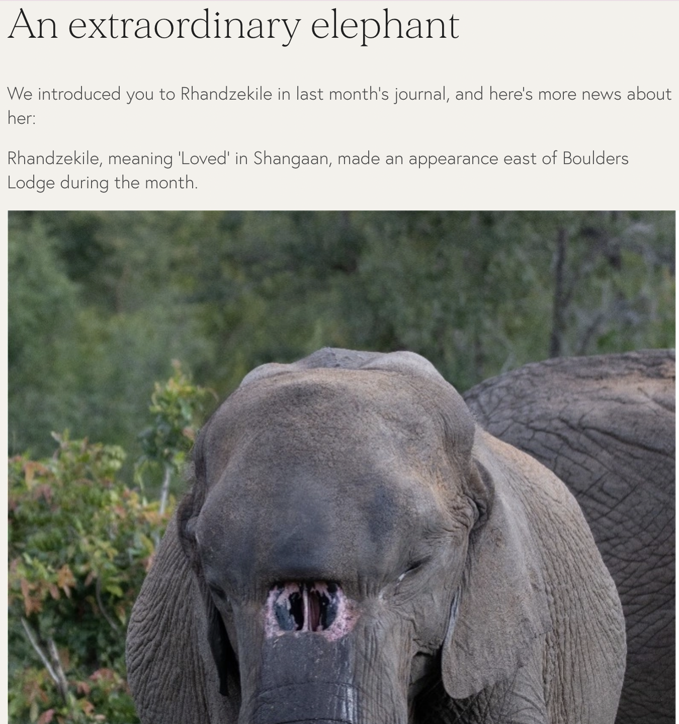 જેમાં અમને વર્ષ એપ્રિલ-2021માં singita નામની વેબસાઇટ પર પ્રકાશિત અહેવાલ પ્રાપ્ત થયો. અહેવાલમાં એક હાથી વિશે જણાવવામાં આવ્યું છે અને તેમાં જે હાથીની તસવીર છે તે હાથી ખરેખર સૂંઢમાં કાણું છે તે જ હાથી છે.