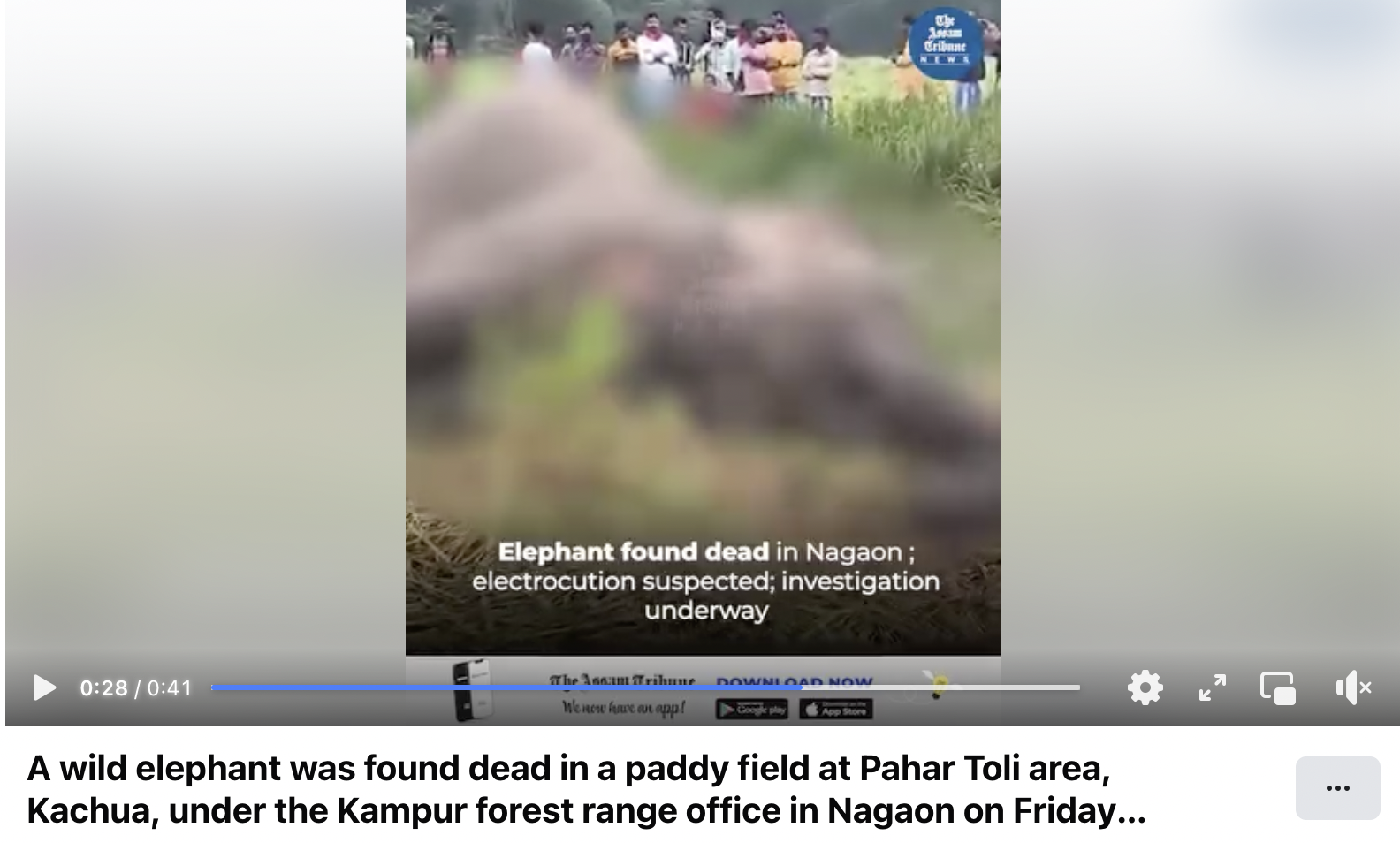 આસામ ટ્રિબ્યૂન દ્વારા કરાયેલ 8 નવેમ્બર-2024ની ફેસબુક પોસ્ટમાં તે વિઝ્યૂઅલ જોઈ શકાય છે. અહેવાલમાં જણાવાયું છે કે વીજકરંટથી હાથીનું મોત થયું હતું અને ગામવાસીઓ ભેગા થઈ ગયા હતા.