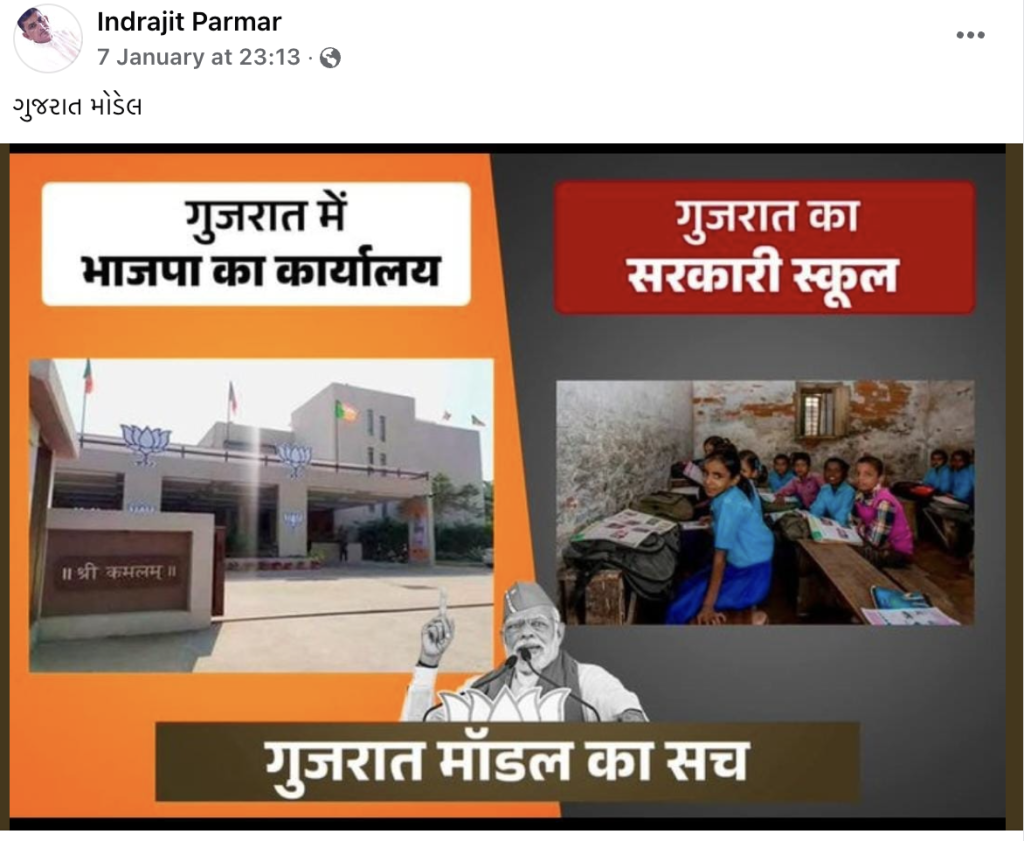 તસવીરમાં એક તરફ રાજકીય પક્ષના ભવનની તસવીર છે અને તેના પર લખ્યું છે, ભાજપની ઑફિસ અને બીજી બાજુ સ્કૂલના એક વર્ગખંડની તસવીર છે, જેના પર લખ્યું છે, ગુજરાતની સ્કૂલની સ્થિતિ. અને બંને પર લખ્યું છે કે , ગુજરાત મૉડલ.