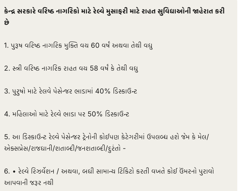 મૅસેજમાં કહેવાયું છે કે, ” કેન્દ્ર સરકારે વરિષ્ઠ નાગરિકો માટે રેલ્વે મુસાફરી માટે રાહત સુવિધાઓની જાહેરાત કરી છે. પુરૂષ વરિષ્ઠ નાગરિક મુક્તિ વય 60 વર્ષ અથવા તેથી વધુ. સ્ત્રી વરિષ્ઠ નાગરિક રાહત વય 58 વર્ષ કે તેથી વધુ. પુરુષો માટે રેલવે પેસેન્જર ભાડામાં 40% ડિસ્કાઉન્ટ. મહિલાઓ માટે રેલ્વે ભાડા પર 50% ડિસ્કાઉન્ટ. આ ડિસ્કાઉન્ટ રેલ્વે પેસેન્જર ટ્રેનોની કોઈપણ કેટેગરીમાં ઉપલબ્ધ હશે જેમ કે મેલ/એક્સપ્રેસ/રાજધાની/શતાબ્દી/જનશતાબ્દી/દુરંતો. રેલ્વે રિઝર્વેશન / અથવા, બધી સામાન્ય ટિકિટો કરતી વખતે કોઈ ઉંમરનો પુરાવો આપવાની જરૂર નથી. જો કે, ટ્રેનમાં મુસાફરી કરતી વખતે, રેલ્વે ટિકિટ ચેક (TC)ના કિસ્સામાં ઉંમરના પુરાવા તરીકે PAN કાર્ડ, આધાર કાર્ડ, ડ્રાઇવિંગ લાઇસન્સ અથવા ફોટો સાથે સરકાર દ્વારા માન્યતા પ્રાપ્ત કોઈપણ પત્ર સબમિટ કરવાનું ફરજિયાત છે. વરિષ્ઠ નાગરિકો તેમની રેલ્વે ટિકિટ કોઈપણ ટિકિટ / રિઝર્વેશન ઑફિસમાંથી અથવા ઇન્ટરનેટ દ્વારા ખરીદી શકે છે. પેસેન્જર રિઝર્વેશન સિસ્ટમ (PRS)માં, વરિષ્ઠ નાગરિકો, સગર્ભા સ્ત્રીઓ અને 45 વર્ષથી વધુ ઉંમરની મહિલાઓને રેલવેમાં સ્લીપર ક્લાસમાં 6 બર્થ, AC-3, AC-2માં 3 બર્થ આપવામાં આવે છે.”