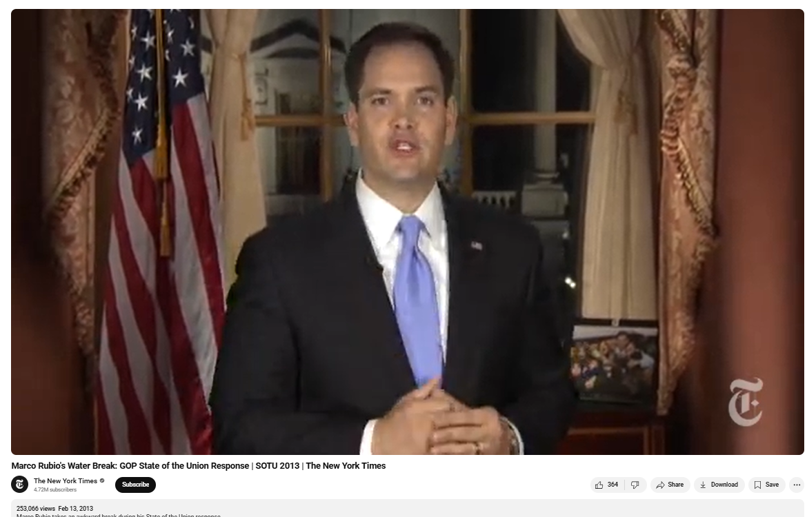 એક વીડિયો રિપોર્ટમાં દર્શાવવામાં આવ્યું છે કે, ડોનાલ્ડ ટ્રમ્પે માર્કો રુબિયો દ્વારા 2013ના સ્ટેટ ઓફ ધ યુનિયન ભાષણનો જવાબ આપતી વખતે ભાષણ દરમિયાન પાણીનો એક ઘૂંટડો લેવા અંગે મજાક કરી હતી. લગભગ 46 સેકન્ડના આ વીડિયોમાં, ટ્રમ્પ ભાષણ આપી રહ્યા છે અને લોકોને પૂછી રહ્યા છે, “શું તમને તે આપત્તિ યાદ છે જ્યારે માર્કો રુબિયાને રાષ્ટ્રપતિ ઓબામાના ભાષણ પર પ્રતિક્રિયા આપવાનું કહેવામાં આવ્યું હતું, અને ભાષણની વચ્ચે તેઓ કેવી રીતે પાણી માટે હાંફી રહ્યા હતા?”