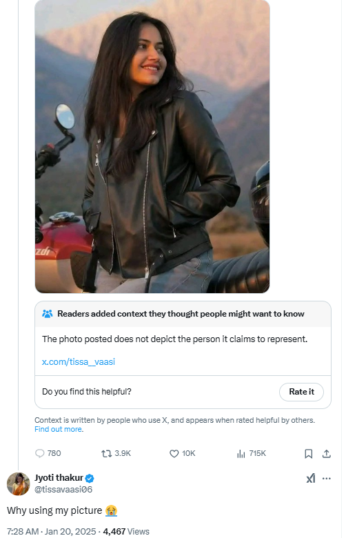દાવાની તપાસ માટે અમે દાવા વિશેની વાઇરલ ઍક્સ પોસ્ટની ચકાસણી કરતા અમને જાણવા મળ્યું કે, સંબંધિત દાવાની તસવીર મામલે જ્યોતિ ઠાકુર નામના એકાઉન્ટ યુઝર દ્વારા એ મામલે પૂછવામાં આવ્યું હતું કે, “તમે મારી તસવીર કેમ વાપરી છે?”