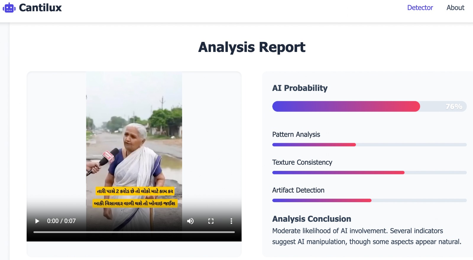 વાઇરલ વીડિયોને એઆઈ ડિટેક્શન ટૂલ દ્વારા પણ સ્કૅન કરીને ચકાસવામાં આવ્યા. જેમાં Authenta, Deepware અને Cantilux સહિતના ટૂલમાં તે એઆઈ દ્વારા નિર્મિત હોવાના પરિણામ મળ્યા છે.