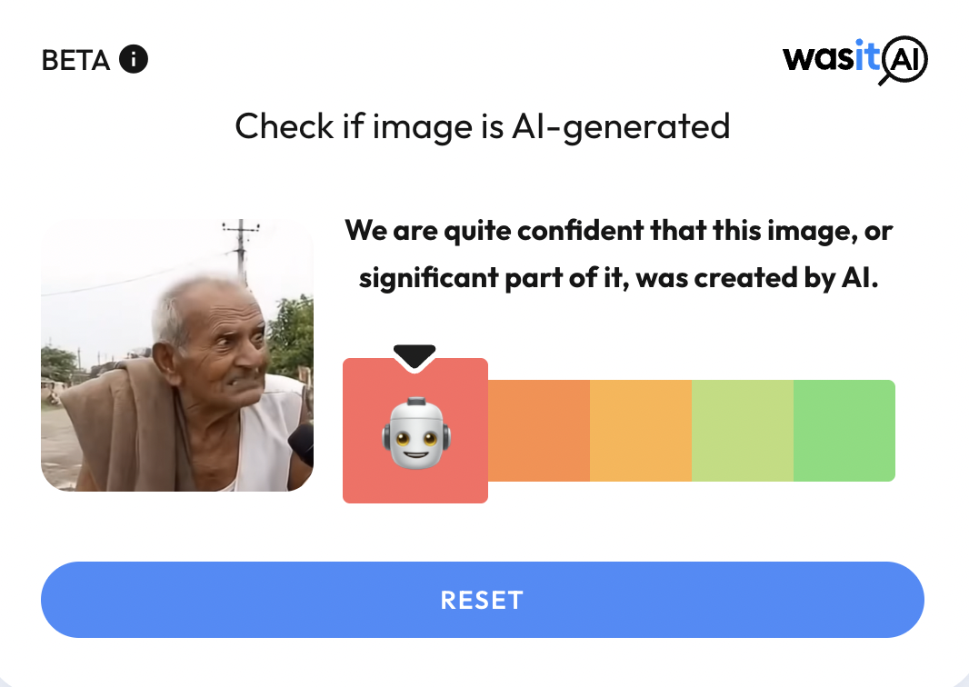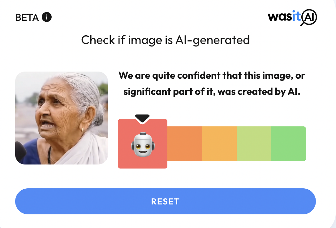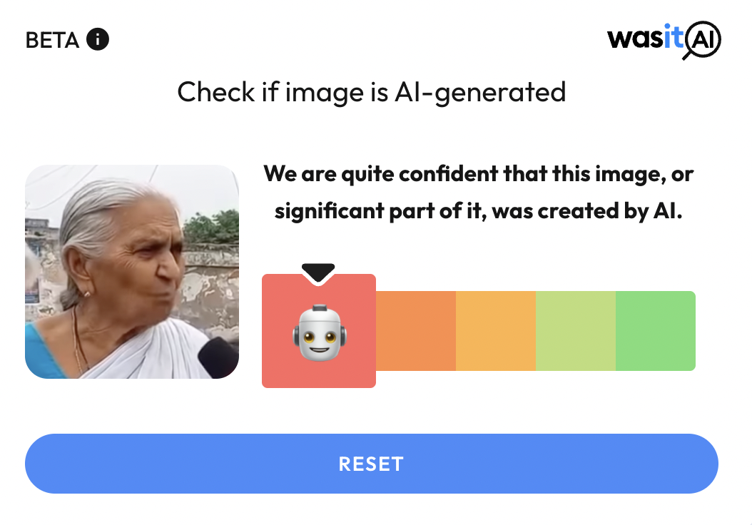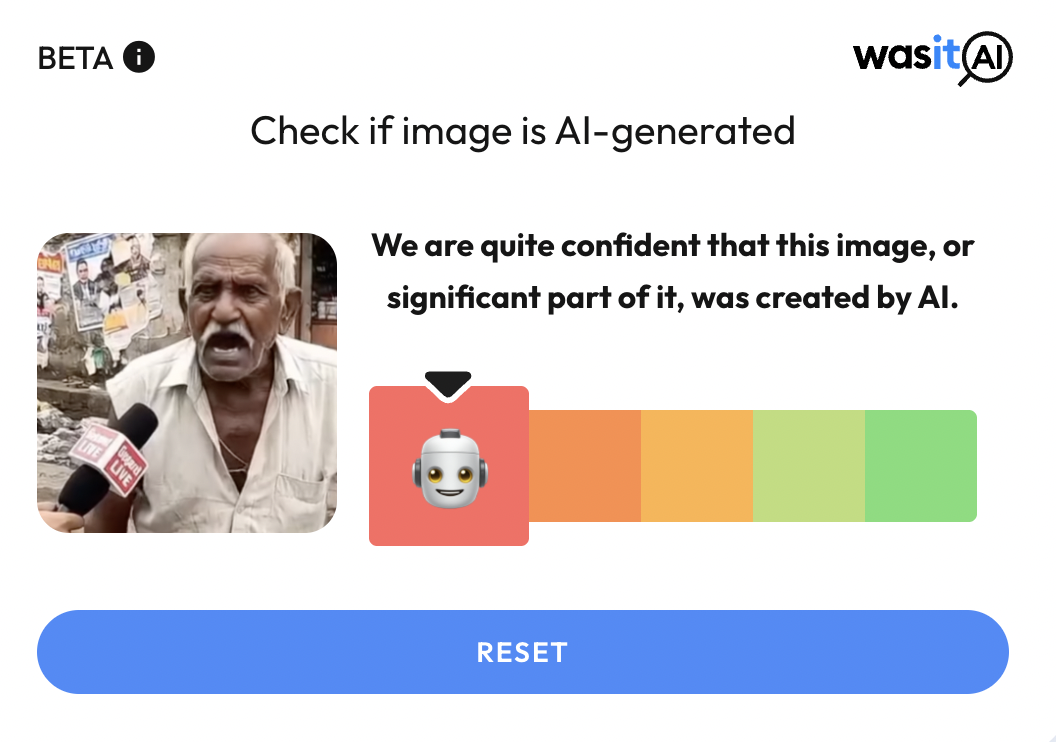 સૌપ્રથમ અમે wasitai એઆઈ (AI) ડિટેક્શન ટૂલની મદદ લીધી. અમે તેની મદદથી વાઇરલ વીડિયોના કીફ્રેમ્સ અપલૉડ કરીને ચકાસ્યા.