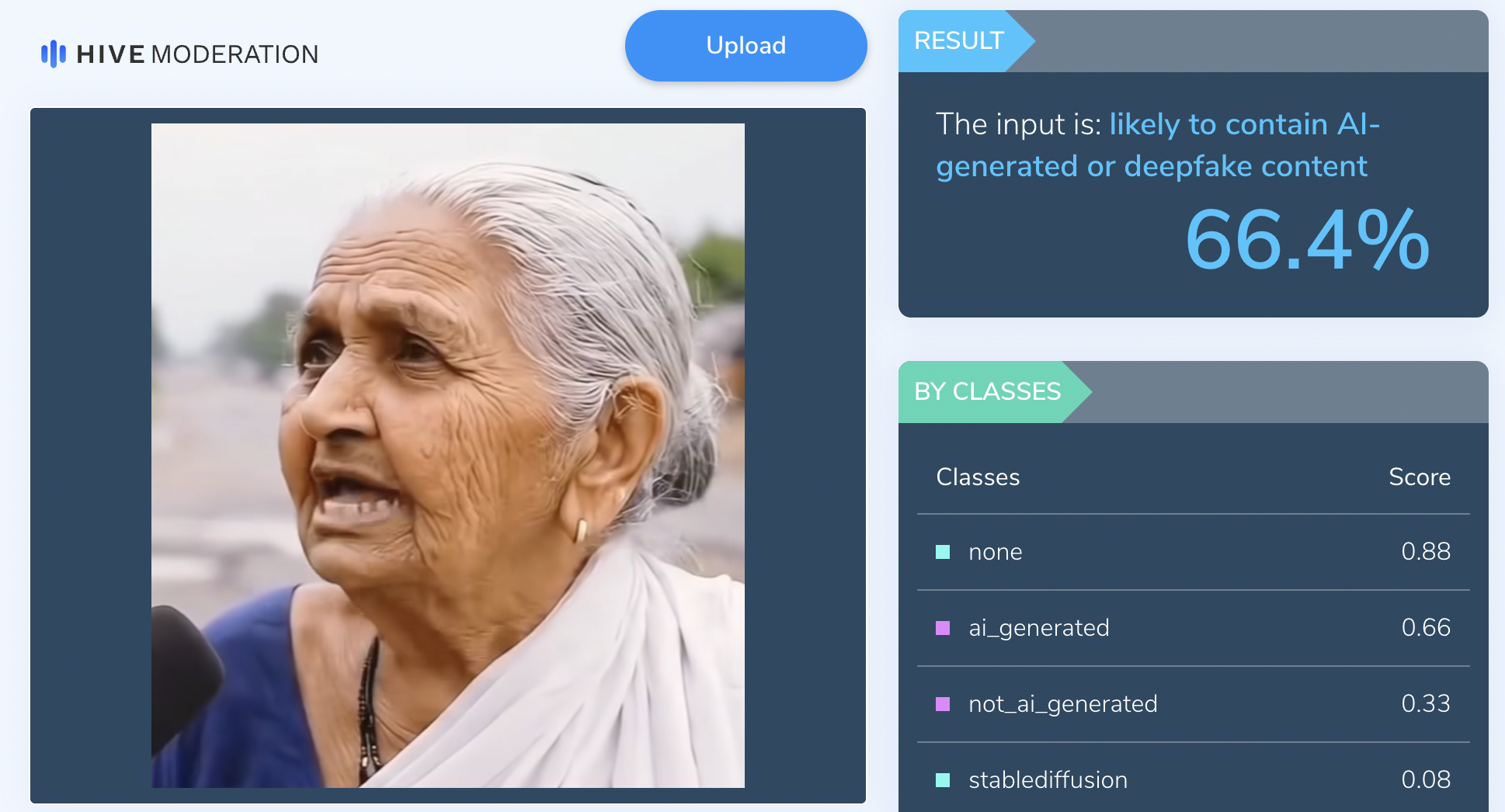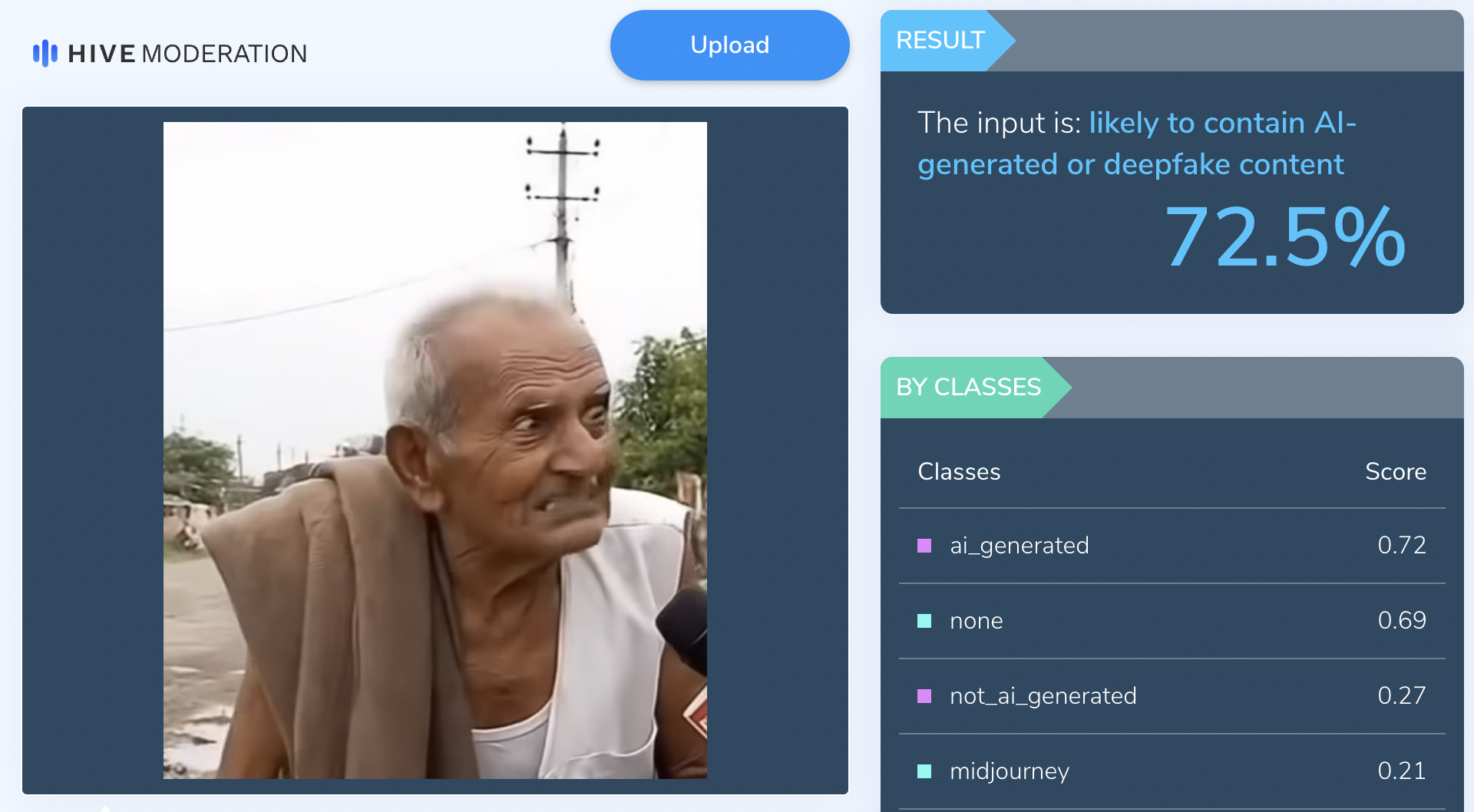 તદુપરાંત, અમે એક અન્ય એઆઈ ડિટેક્શન ટૂલ Hive Moderationની પણ મદદથી કીફ્રેમ્સ અપલૉડ કરી ચકાસ્યા.
