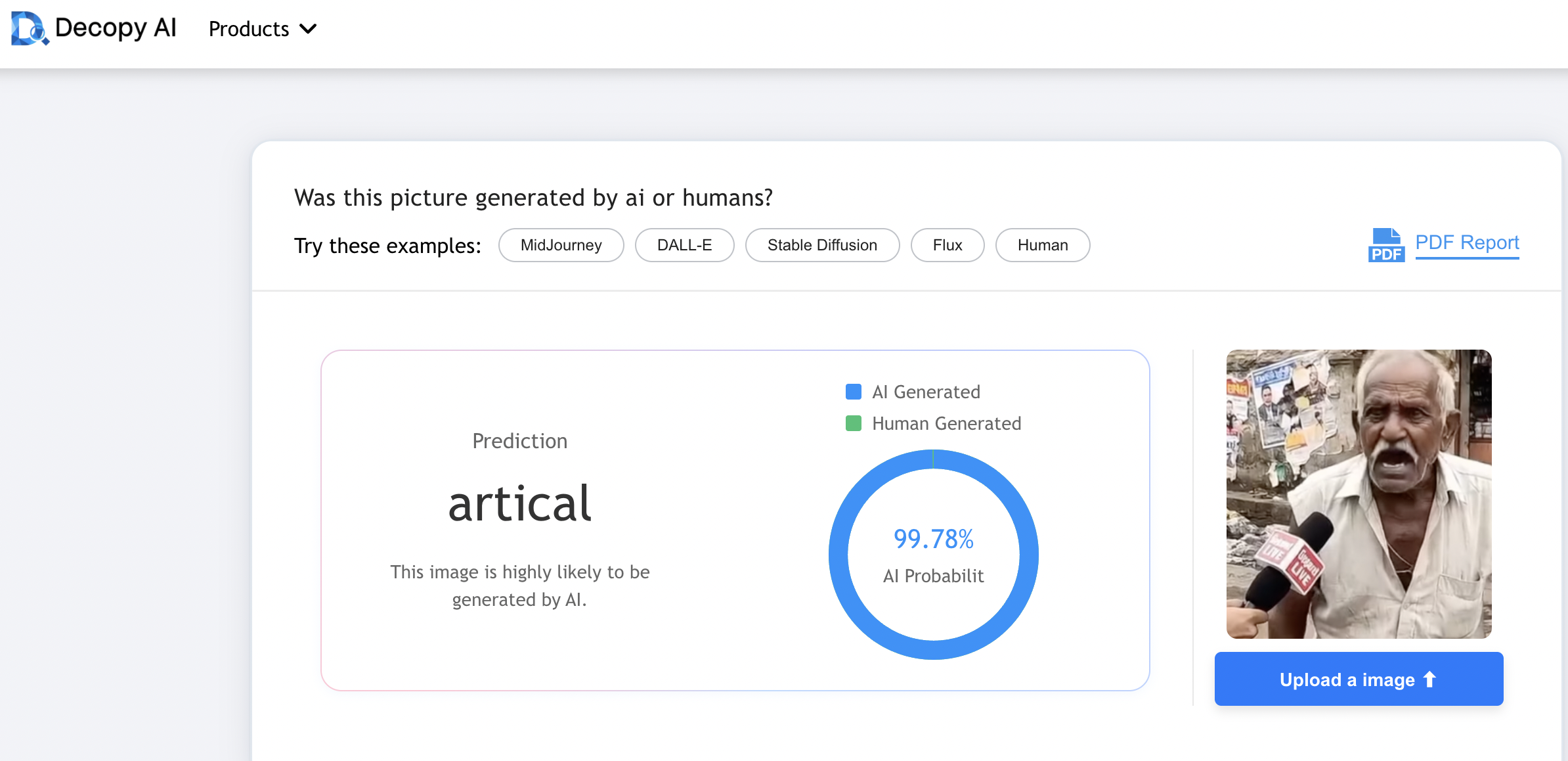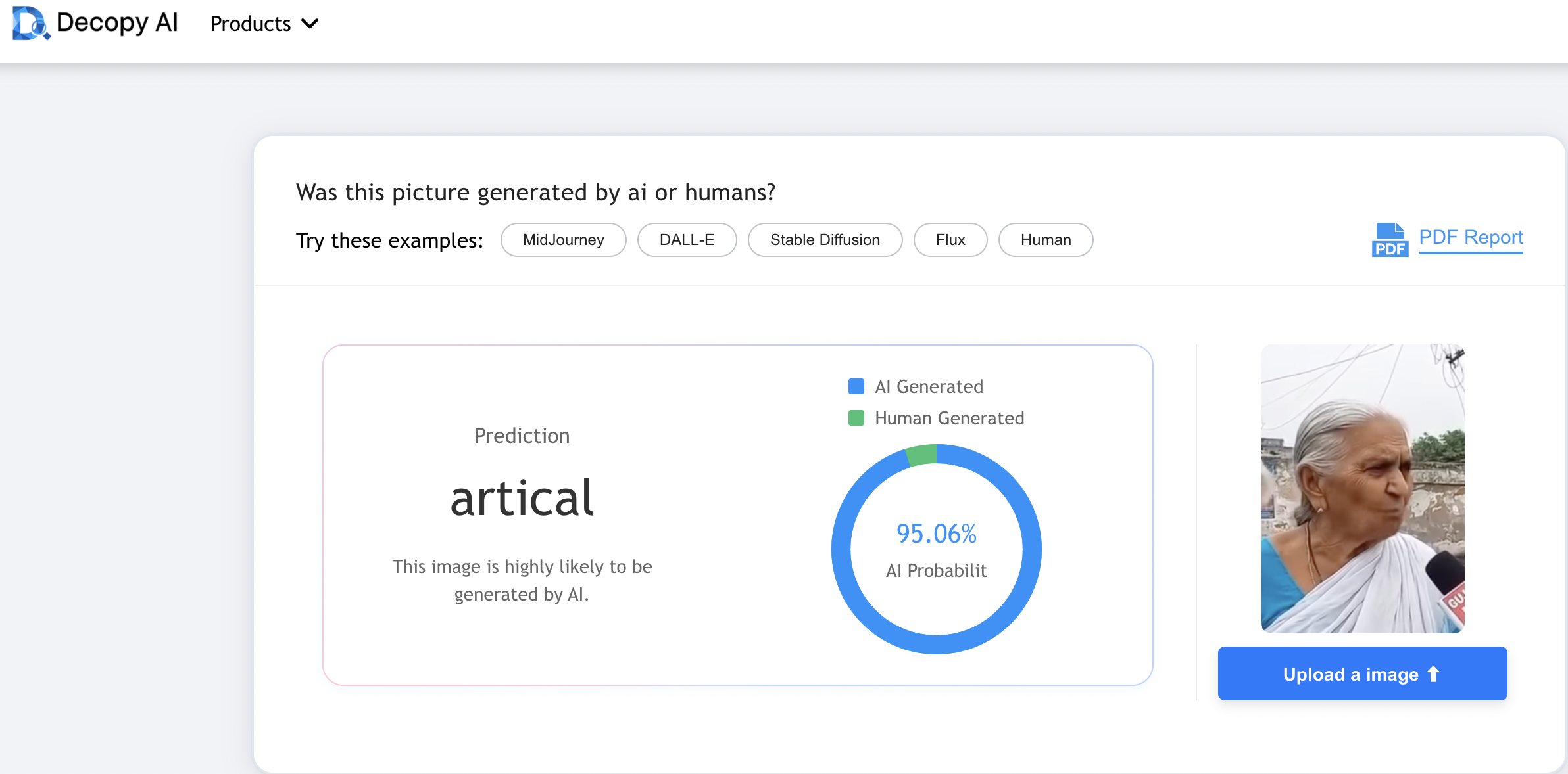 વધુમાં અમે Decopy AI ટૂલની પણ મદદ લીધી. અને ફ્રેમ્સને સ્કૅન કર્યાં. જેમાં અમને જાણવા મળ્યું કે, તે 95 ટકાથી વધુ એઆઈ નિર્મિત છે.