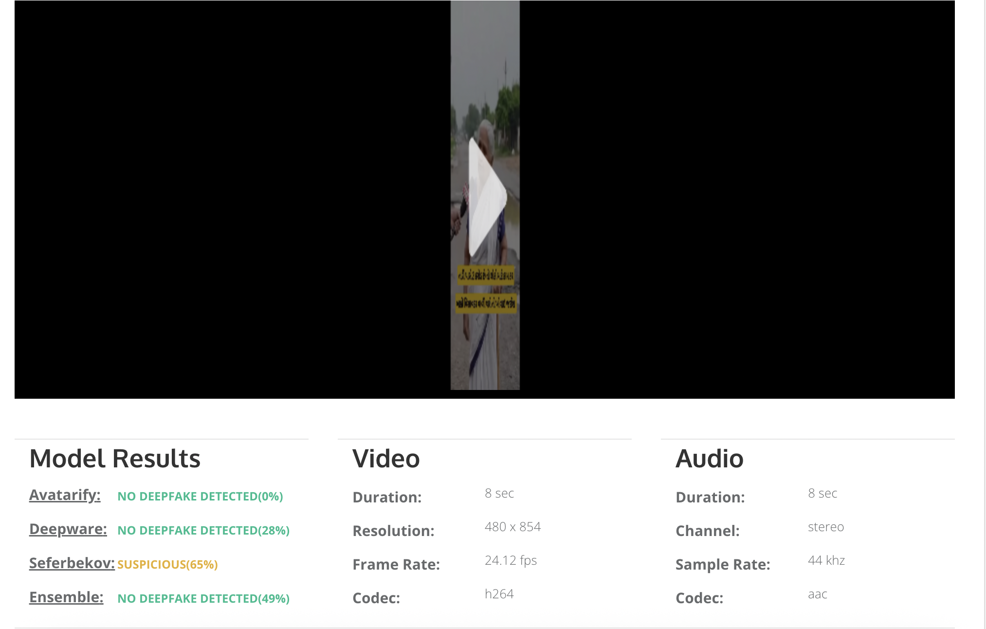 તેમાં અમને પરિણામ સ્વરૂપે જાણવા મળ્યું કે, તમામ કીફ્રેમ્સ એઆઈ દ્વારા બનાવવામાં આવેલ છે. એટલે કે વીડિયો એઆઈ દ્વારા નિર્મિત છે. એઆઈ ડિટેક્શન ટૂલે સ્પષ્ટ જણાવ્યું કે તે ચોક્કસપણે એઆઈ નિર્મિત વીડિયો છે.