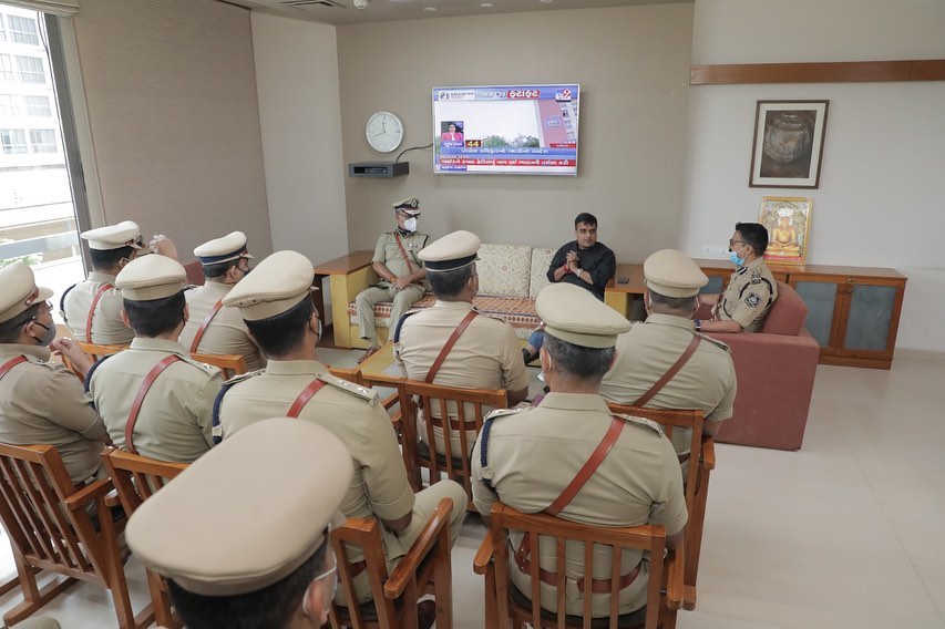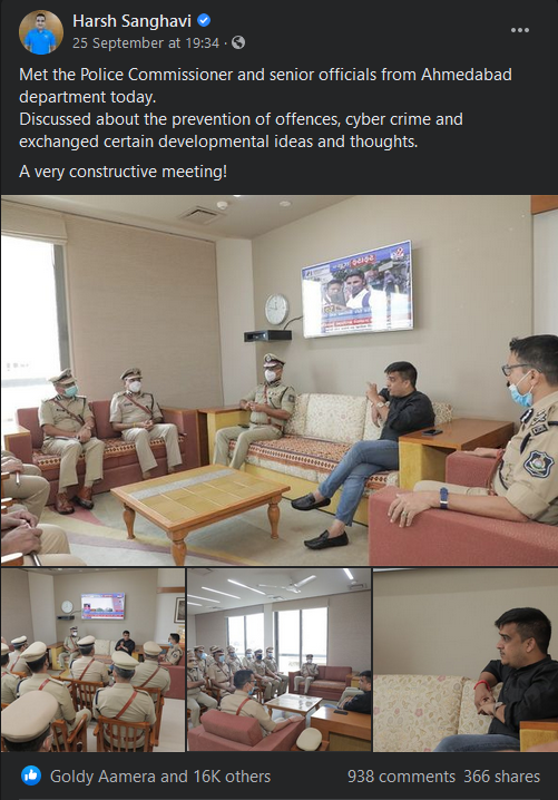 બિહારના 8 પાસ મંત્રી IPS અને IAS સાથે મિટિંગ કરી રહ્યા હોવાના દાવા સાથે શેર કરવામાં આવેલ તસ્વીરને ધ્યાનપૂર્વક જોતા મિટિંગ લઇ રહેલા નેતા ગુજરાતના નવા બનેલા હોમ મિનિસ્ટર હર્ષ સંઘવી હોવાનું જણાય છે. જે મુદ્દે તેમના ઓફિશ્યલ ફેસબુક એકાઉન્ટ પર સર્ચ કરતા 25 સપ્ટેમ્બરના ગુજરાત પોલીસના વડાઓ સાથે થયેલ મિટિંગ અંગે જાણકારી આપતી પોસ્ટ જોવા મળે છે, જ્યાં વાયરલ તસ્વીર પણ જોઈ શકાય છે.